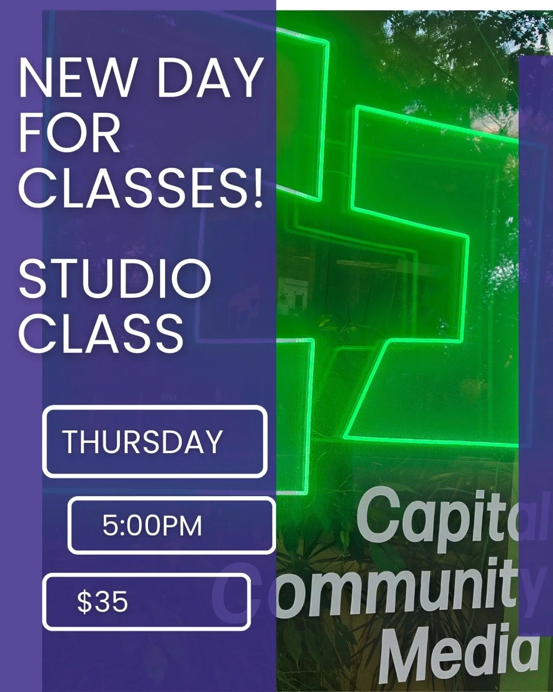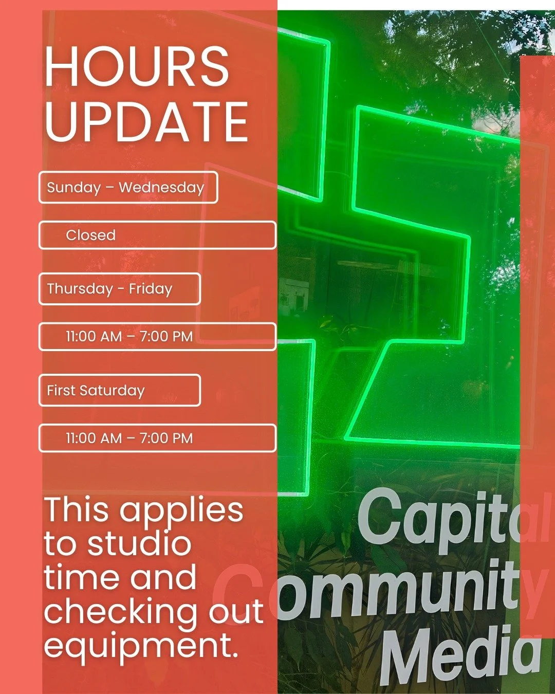 Our hours of operation, studio times, equipment check outs, and classes will be changing.